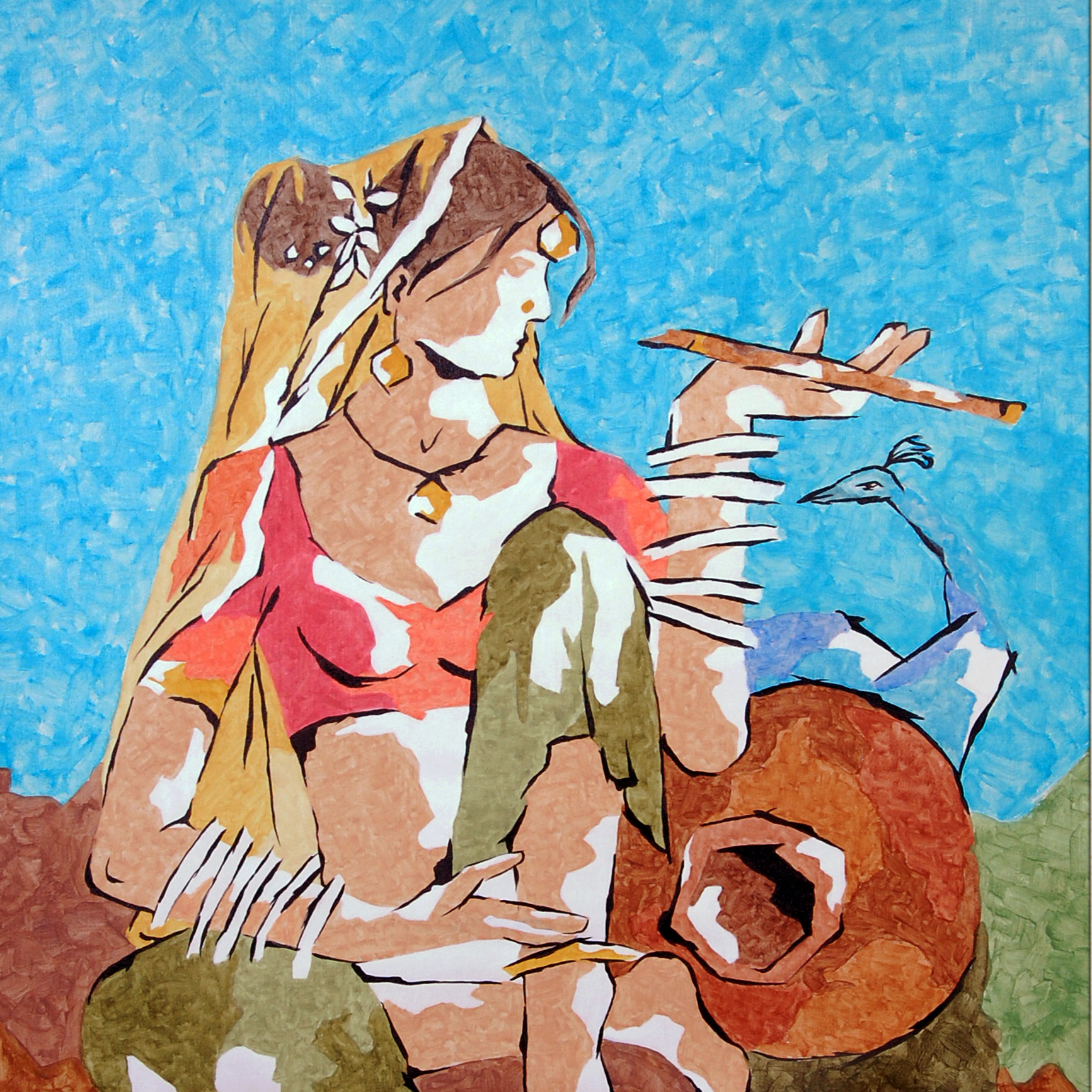 Drawing from her roots in Rajasthan, India, her paintings often blend elements of mythology, music, and movement to create immersive, evocative compositions.